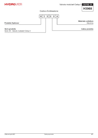 Valvole modulari Cetop 3 SERIE 39 H3968 Codice d’ordinazione H 3 9 6 8 A Materiale collettore Prodotto Hydrover Alluminio Serie prodotto Indice prodotto Serie 39 - Valvole modulari Cetop 3 Edizione luglio 2025 Catalogo generale 417